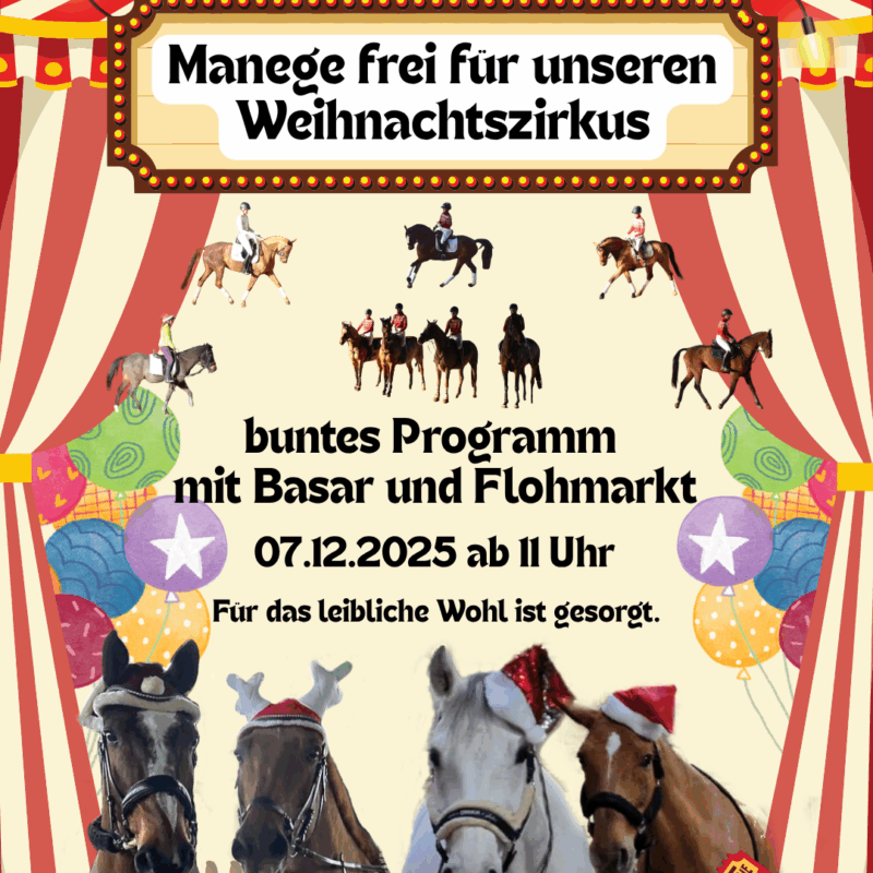 Am 07.12.2025 ab 11 Uhr findet unser diesjähriges Weihnachtsreiten unter dem Motto „Manege frei für unseren Weihnachtszirkus“ statt.